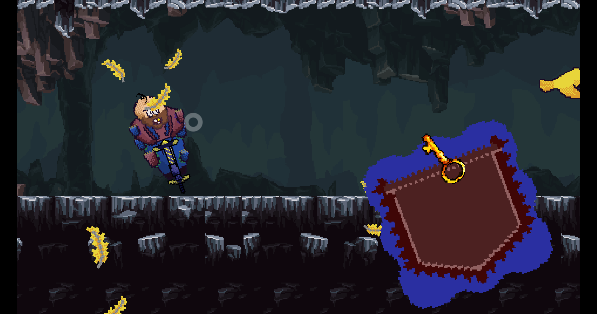 The player can decide the jump angle with the mouse cursor and, when pressing down left click, it begins to contract. The more time the player is pressing, the harder the jump. When the player releases the click, it releases the spring from the potential energy and makes it naturally jump. With a right click, the player cancels the jump.